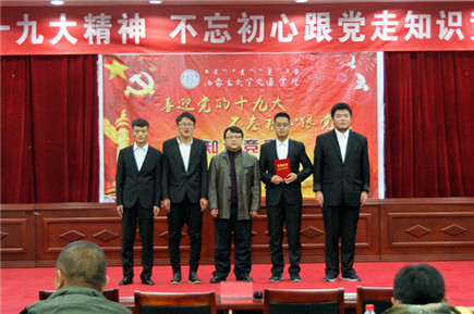 郭鵬飛代表黨群工作部和學(xué)生工作處(團(tuán)委)總結(jié)點(diǎn)評本次活動(dòng)。他首先祝賀本次競賽活動(dòng)取得圓滿成功,祝賀所有參賽選手在活動(dòng)中得到巨大的知識和精神上的收獲。他指出,在我院持續(xù)掀起學(xué)習(xí)貫徹宣傳黨的十九大精神熱潮時(shí),主題知識競賽活動(dòng)無疑起到了薪添旺火的作用,題庫設(shè)計(jì)量大面廣點(diǎn)全,準(zhǔn)備工作非常充分,競賽選手的臨場表現(xiàn)和發(fā)揮集中體現(xiàn)了我院學(xué)生朝氣蓬勃的青春力量和堅(jiān)定執(zhí)著地共產(chǎn)主義理想信念。他強(qiáng)調(diào),青年學(xué)生是祖國和民族未來的希望,一定要懷著“不忘初心跟黨走、青春建功新時(shí)代”的執(zhí)著信念,把個(gè)人的理想追求融入國家和民族的事業(yè)中,從自身成長和社會(huì)發(fā)展進(jìn)步兩個(gè)角度全面把握培育和踐行新時(shí)代青年的內(nèi)在要求。學(xué)院會(huì)為青年大學(xué)生對習(xí)近平新時(shí)代中國特色社會(huì)主義思想的學(xué)習(xí)貫徹宣傳創(chuàng)造更多有利條件,學(xué)院已經(jīng)在學(xué)生中成立了青年馬克思讀書會(huì),還將成立學(xué)習(xí)習(xí)近平新時(shí)代中國特色社會(huì)主義思想學(xué)生研究會(huì)和十九大精神學(xué)生宣講團(tuán)。他號召全院學(xué)生要把握歷史機(jī)遇,肩負(fù)偉大的歷史責(zé)任,用自己的實(shí)際行動(dòng)將個(gè)人夢和中國夢相結(jié)合,腳踏實(shí)地,奮力前行,為實(shí)現(xiàn)中華民族偉大復(fù)興中國夢而不斷努力。