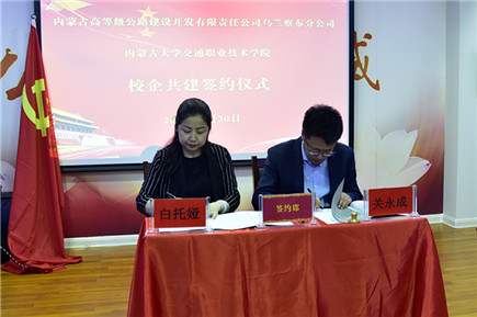 2019年5月30日上午,內(nèi)蒙古大學(xué)交通學(xué)院與內(nèi)蒙古高路公司烏蘭察布分公司校企合作簽約儀式在企業(yè)培訓(xùn)中心會議室舉行。內(nèi)蒙古高路公司烏蘭察布分公司總經(jīng)理關(guān)永成、黨委辦公室主任郝宗濤,學(xué)院黨委副書記、紀(jì)委書記白托婭和學(xué)院相關(guān)部門負(fù)責(zé)人出席簽約儀式。