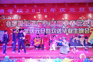 柴金義院長(zhǎng)致新年賀詞 領(lǐng)導(dǎo)與晚會(huì)演職人員合影 左為常務(wù)副院長(zhǎng)董平,右為副院長(zhǎng)武鈞 右為黨委副書記、紀(jì)委書記白托婭,左為黨委委員趙志蒙 開場(chǎng)舞《蒙古族舞蹈:賽白努》 晚會(huì)主持人 部門領(lǐng)導(dǎo)、系部領(lǐng)導(dǎo)及學(xué)工辦主任、班主任 教師們傾情表演《歌曲串燒》 歌伴舞表演《曹操》 魔術(shù)表演 歌曲《站在草原望北京》 歌曲《漫步人生路之夜來(lái)香》 舞蹈《up down & shake it》 朗誦《不悔夢(mèng)歸處 只恨太匆匆》 小品《我是演員》 相聲《我要畢業(yè)了》 動(dòng)感街舞表演 舞蹈《青春的告白》