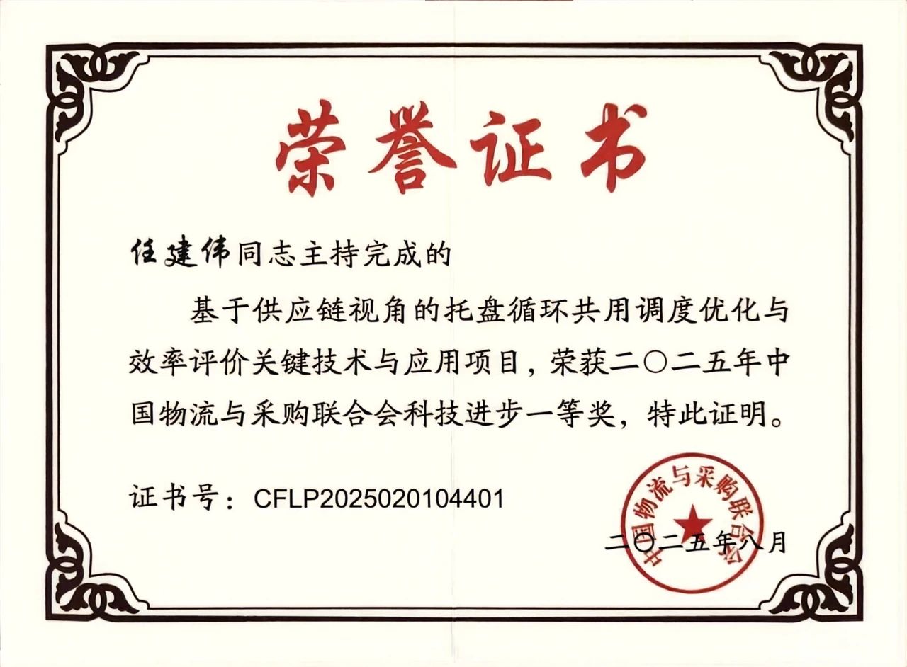 近日,中國(guó)物流與采購(gòu)聯(lián)合會(huì)(CFLP)正式公布了2025年度科學(xué)技術(shù)獎(jiǎng)評(píng)審結(jié)果。我院任建偉教授團(tuán)隊(duì)的研究成果“基于供應(yīng)鏈視角的托盤(pán)循環(huán)共用調(diào)度優(yōu)化與效率評(píng)價(jià)關(guān)鍵技術(shù)與應(yīng)用”榮獲科技進(jìn)步獎(jiǎng)一等獎(jiǎng)。成果主要完成人:任建偉、李成兵、陳春花、孫哲、徐鐵、李一川、閆振英、霍月英、張鵬、魏中華、喬曉波。